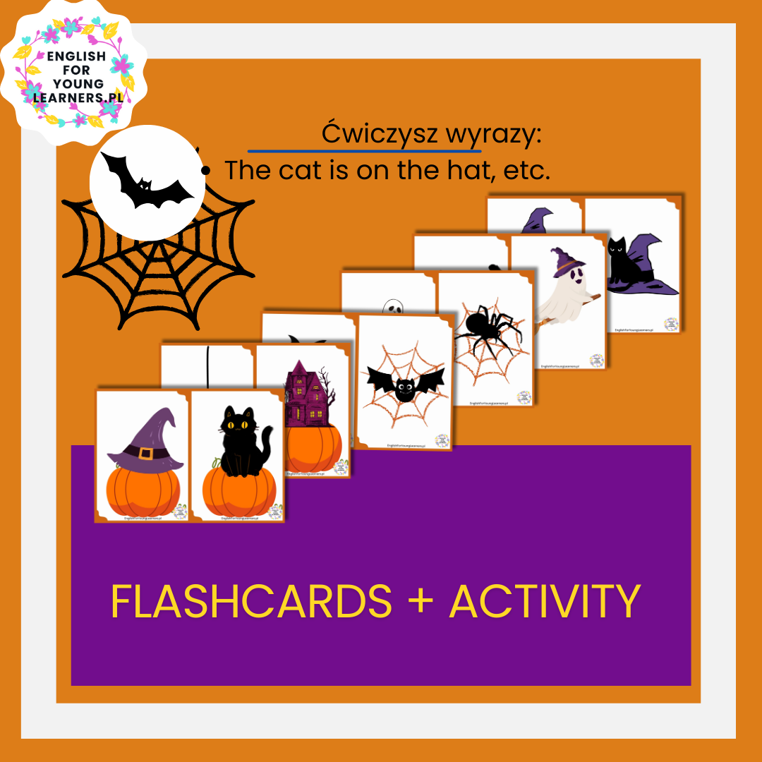 - wyrazów: ghost, black cat, hauted house, spider net, spider, hat, pumpkin, bat